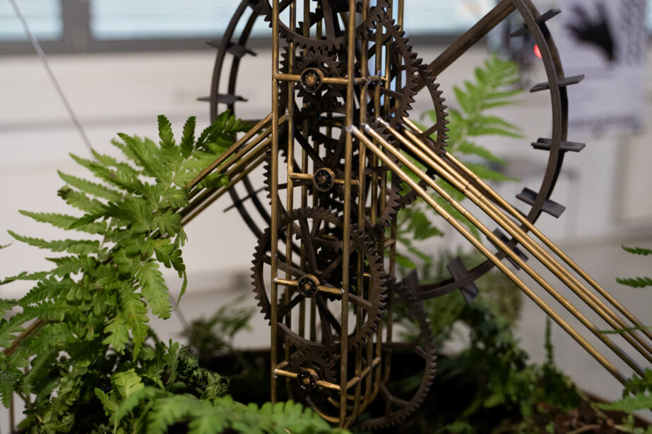 Water-powered gears of biodegradable plastic relentlessly churn above a basin, circulating water through an extractive, self-eroding engine of capitalist time. Beneath this mechanism, a verdant bed of moss and ferns, among Earth’s oldest plant forms, drinks in the cascade, symbolizing ecological time and nature’s cyclical resilience.