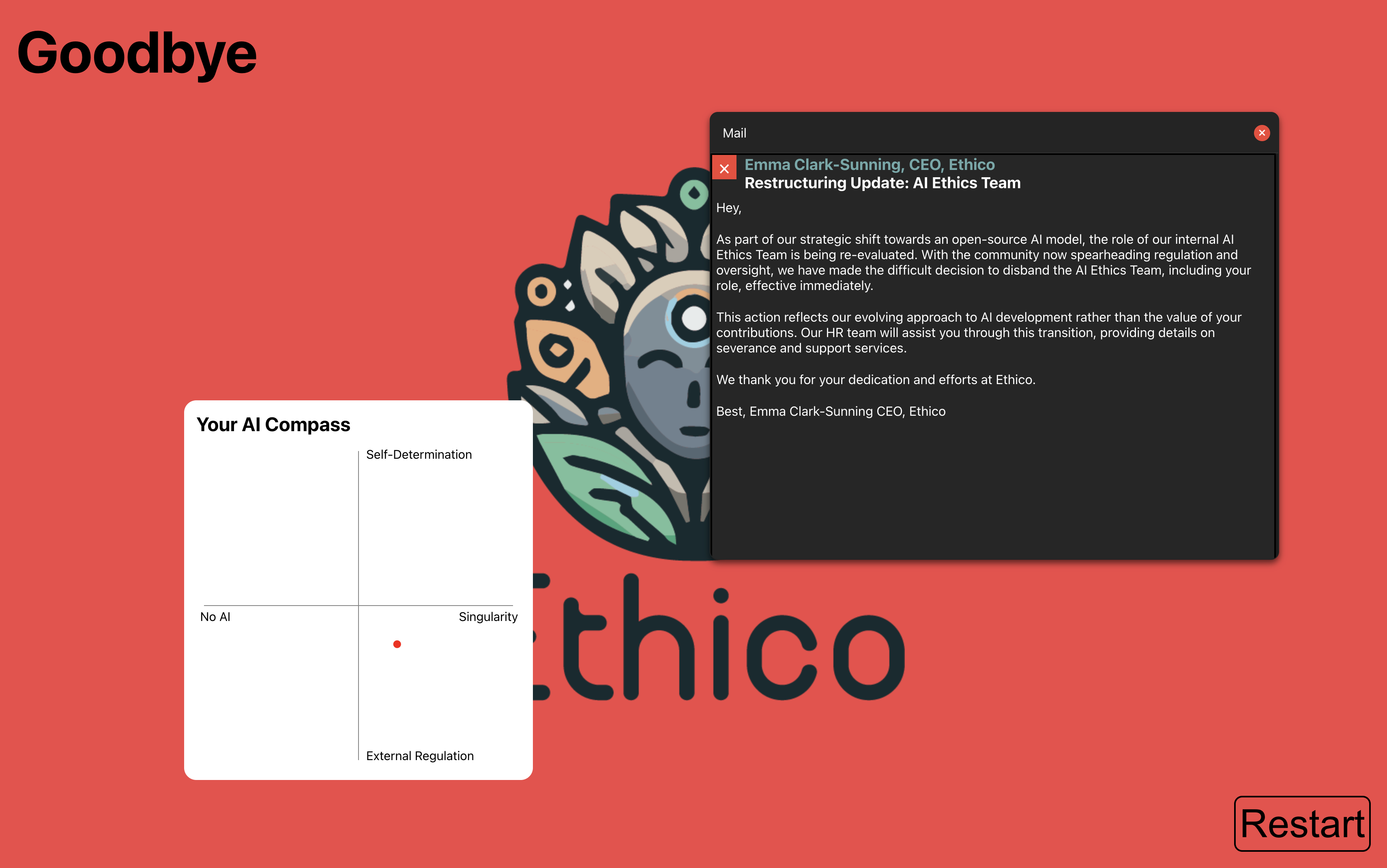 In Ethico, players act as interns at a tech startup, helping clients regulate their AI products. They interact with various characters, like the busy manager Max and the helpful research assistant Olivia. The impact of the players’ decisions on the game’s progression and characters’ behaviours is for the players to discover.