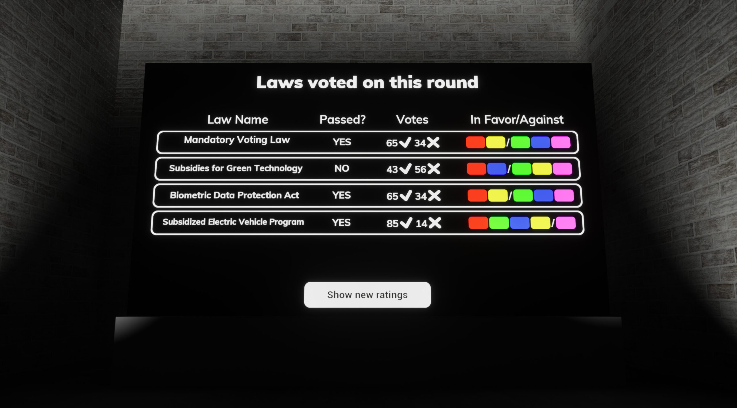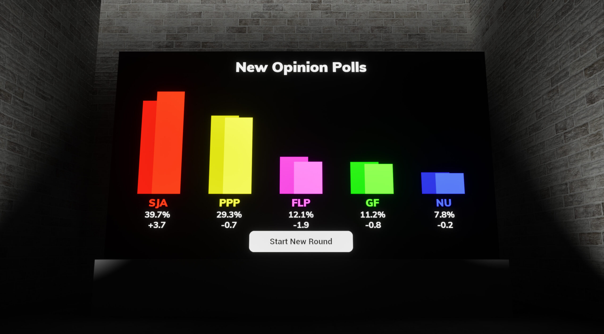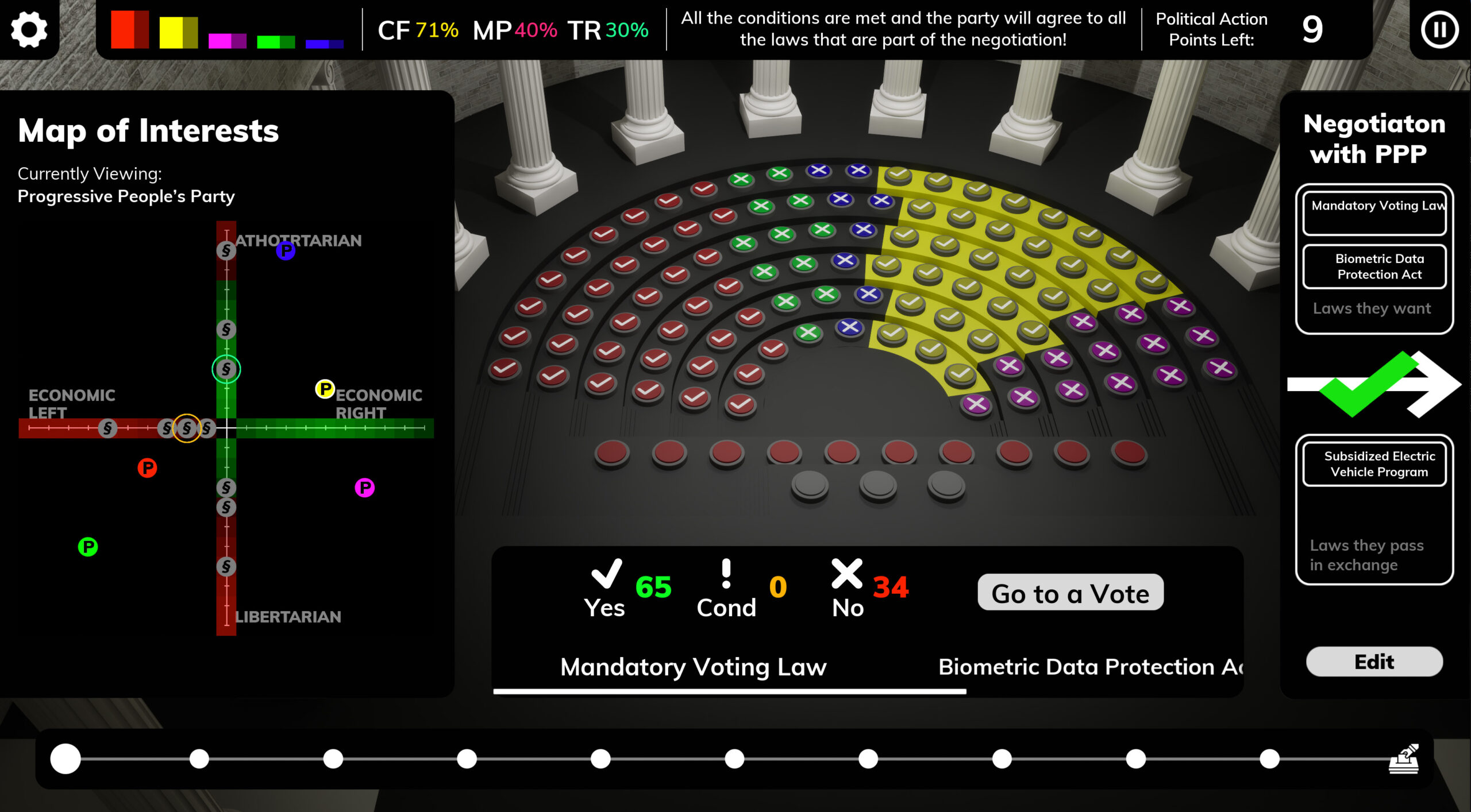 Once renowned as a beacon of democracy, the nation has recently plunged into political turmoil. Deep societal divisions have fueled growing polarisation, with political factions becoming increasingly hostile toward one another. In this climate, players take control of the country ’s largest party, which currently leads a minority government. Every law the players seek to pass – to advance their legislative agenda and maintain voter trust – requires negotiation with the other parties in parliament.