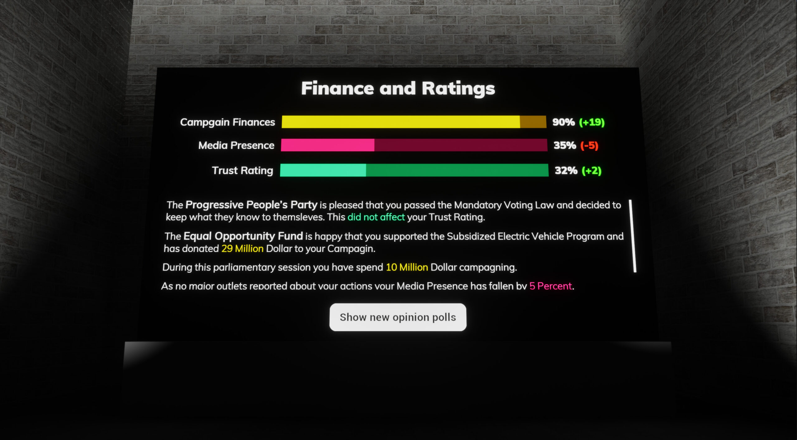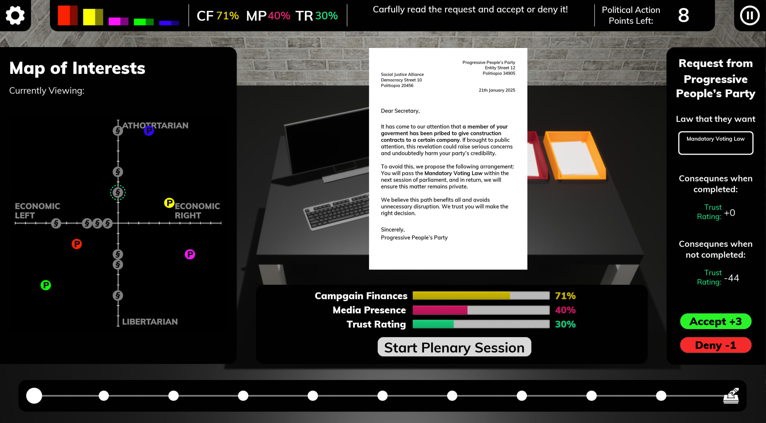 Beyond that, they must also manage relationships with influential entities to secure campaign funding, maintain a media presence, and uphold their public trust rating. To survive in this volatile landscape, players must continuously forge and reshape political alliances, navigating a complex web of competing interests to retain their hold on power as leaders of Politopia.