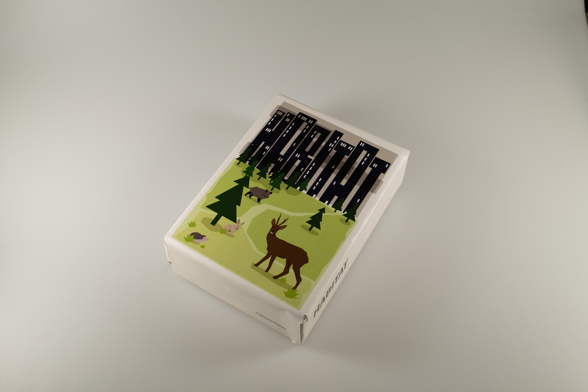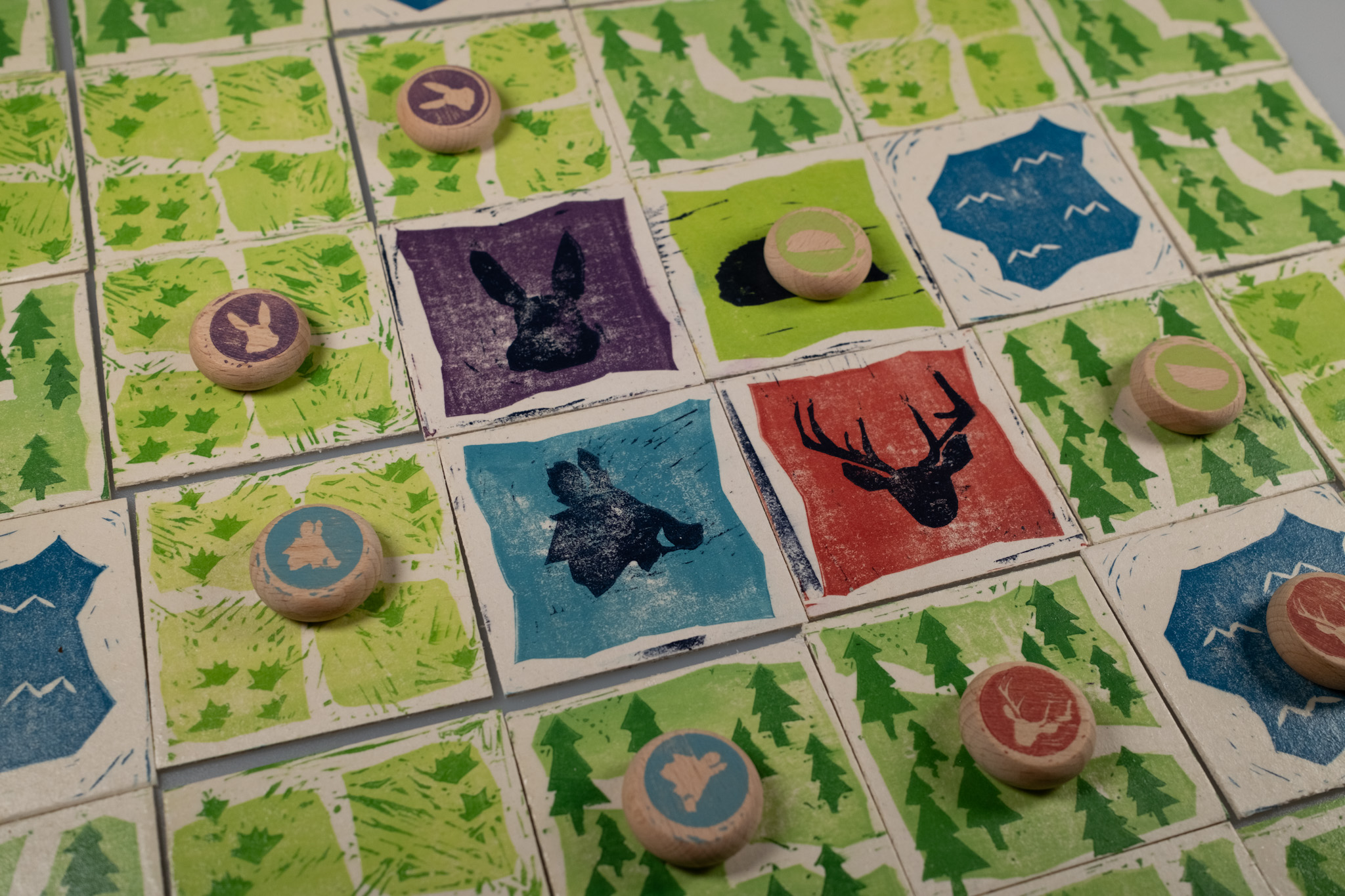 “Habitat” is a cooperative board game where players work together as forest animals to slow down urban expansion and preserve their ecosystem.