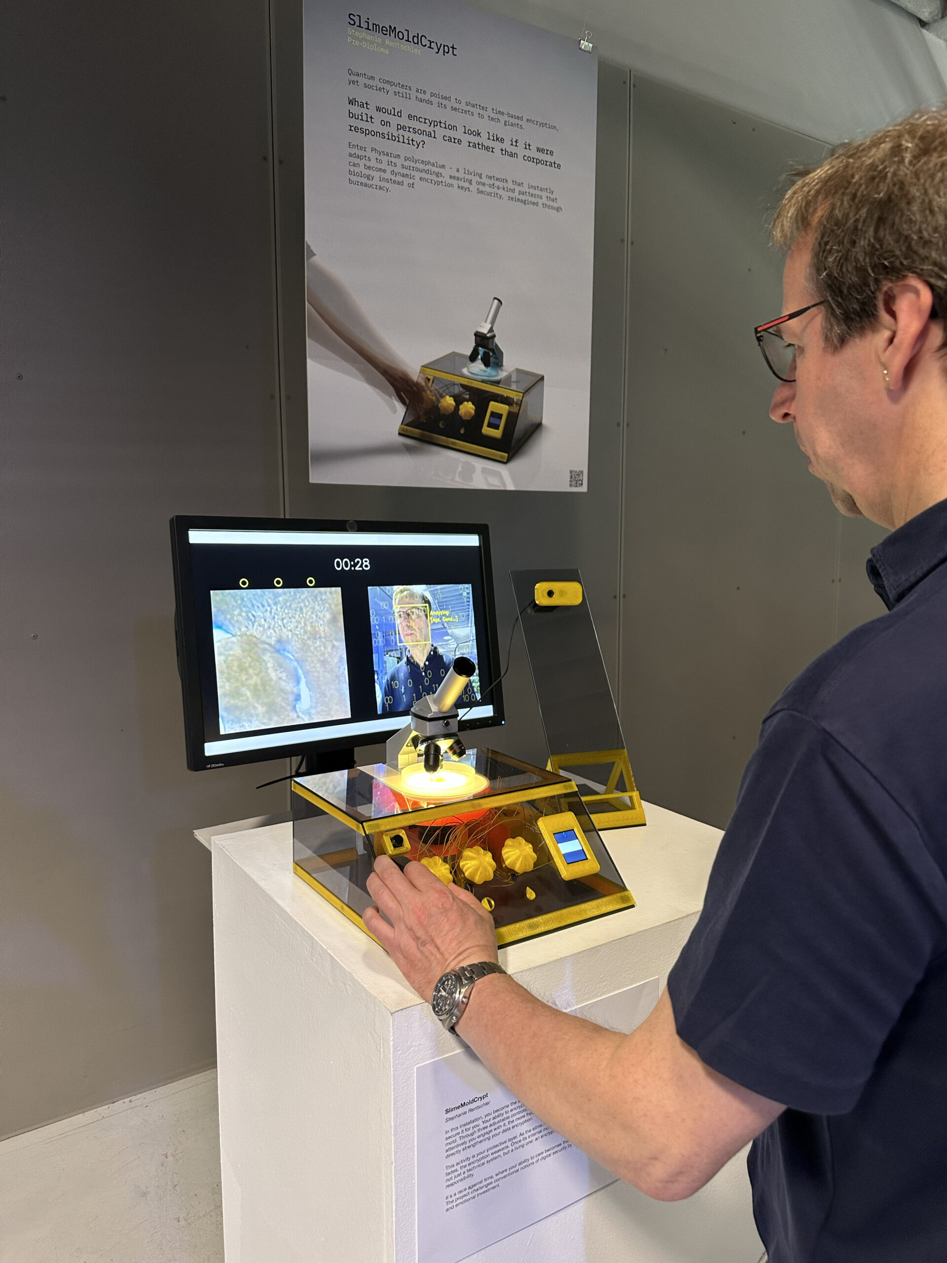 In this installation, you become the sole guardian of your own data without relying on tech companies to secure it for you. Your ability to encrypt information depends on how well you care for a living slime mold. Through three adjustable controls, you must respond to its needs in real time. The more attentively you engage with it, the more frequent and dynamic its inner cellular activity becomes, directly strengthening your data encryption.