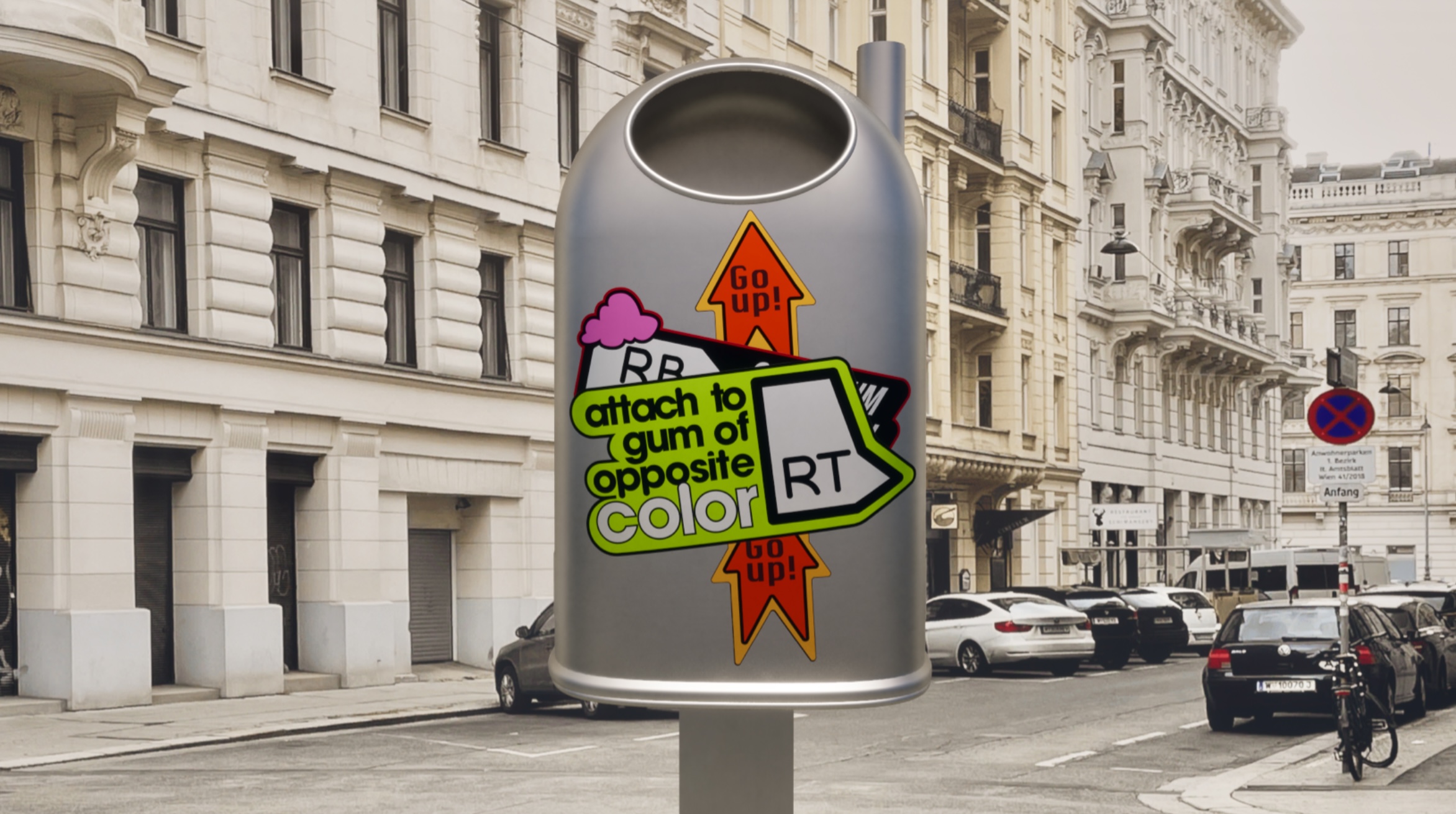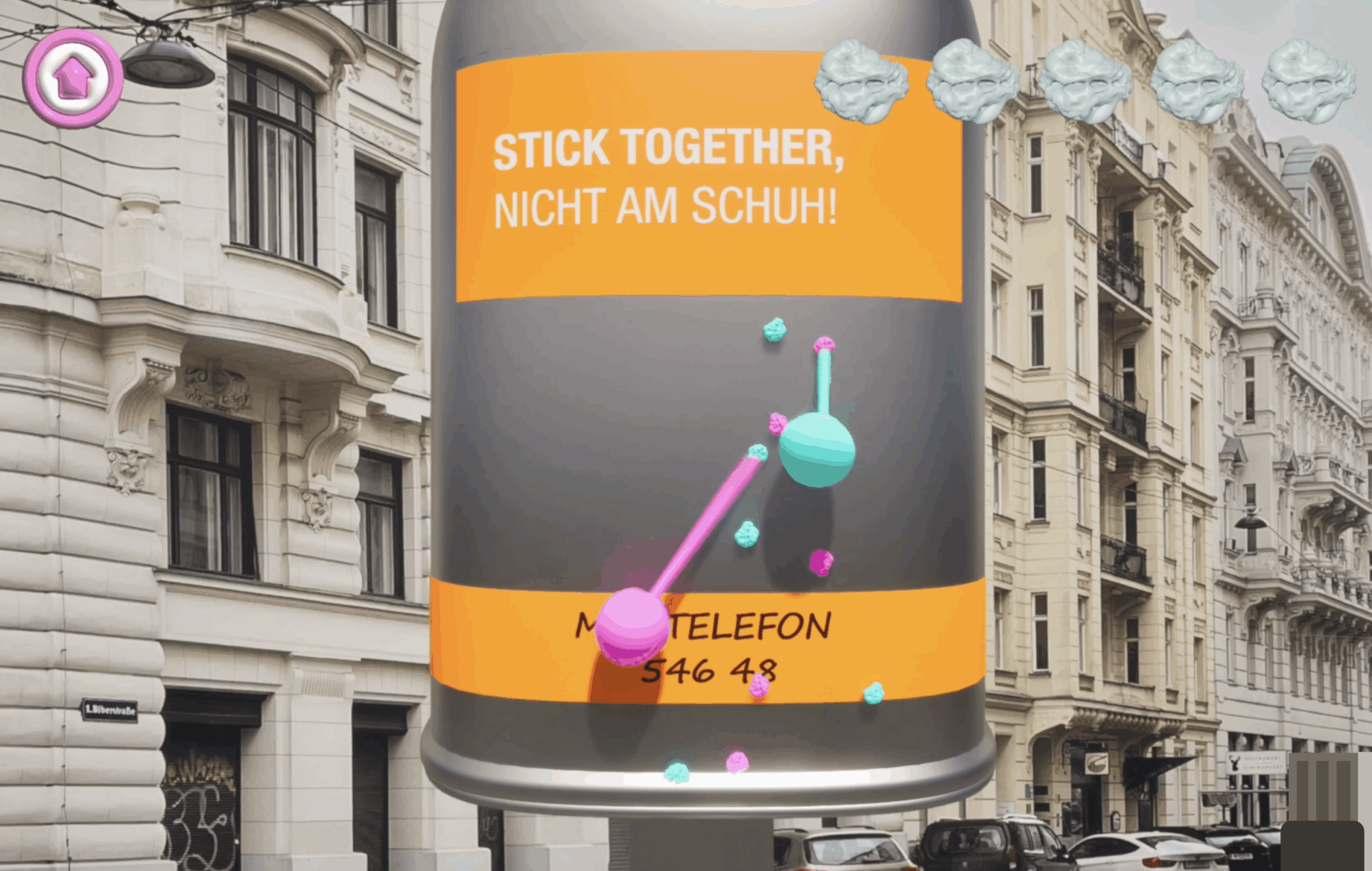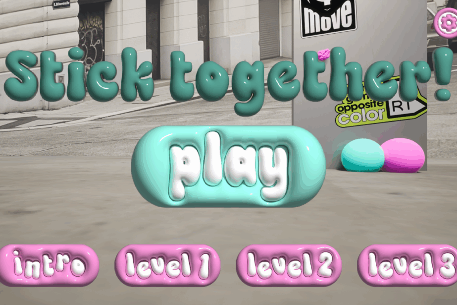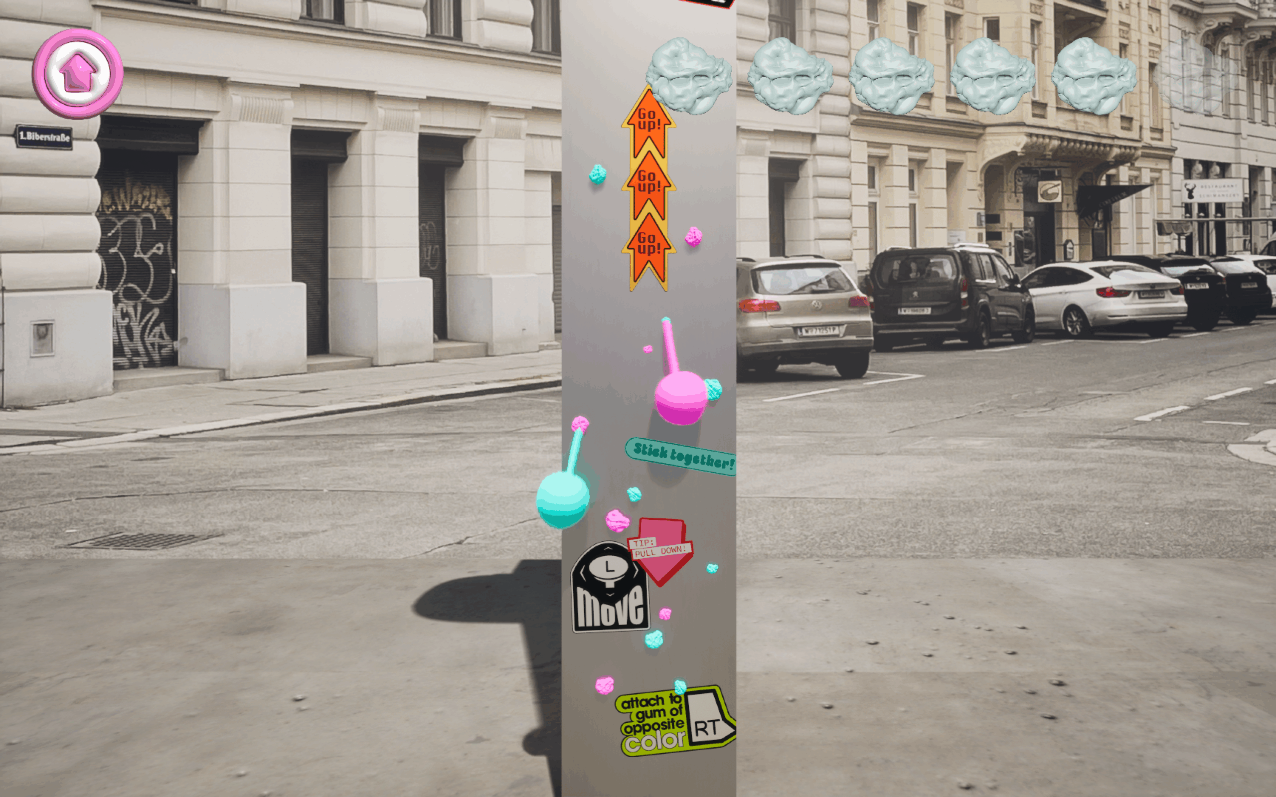 Stick together! is a simple physics-based video game. As pink and blue chewing gums, two players cooperate climbing up a public trash bin. Each player can stick little pieces of gum to the pole that the other – but only the other – player can attach to in order to get up. This aspect of having to help each other up enforces the so-called meta-game, the interaction between the players discussing strategies, giving advice or simply laughing together.