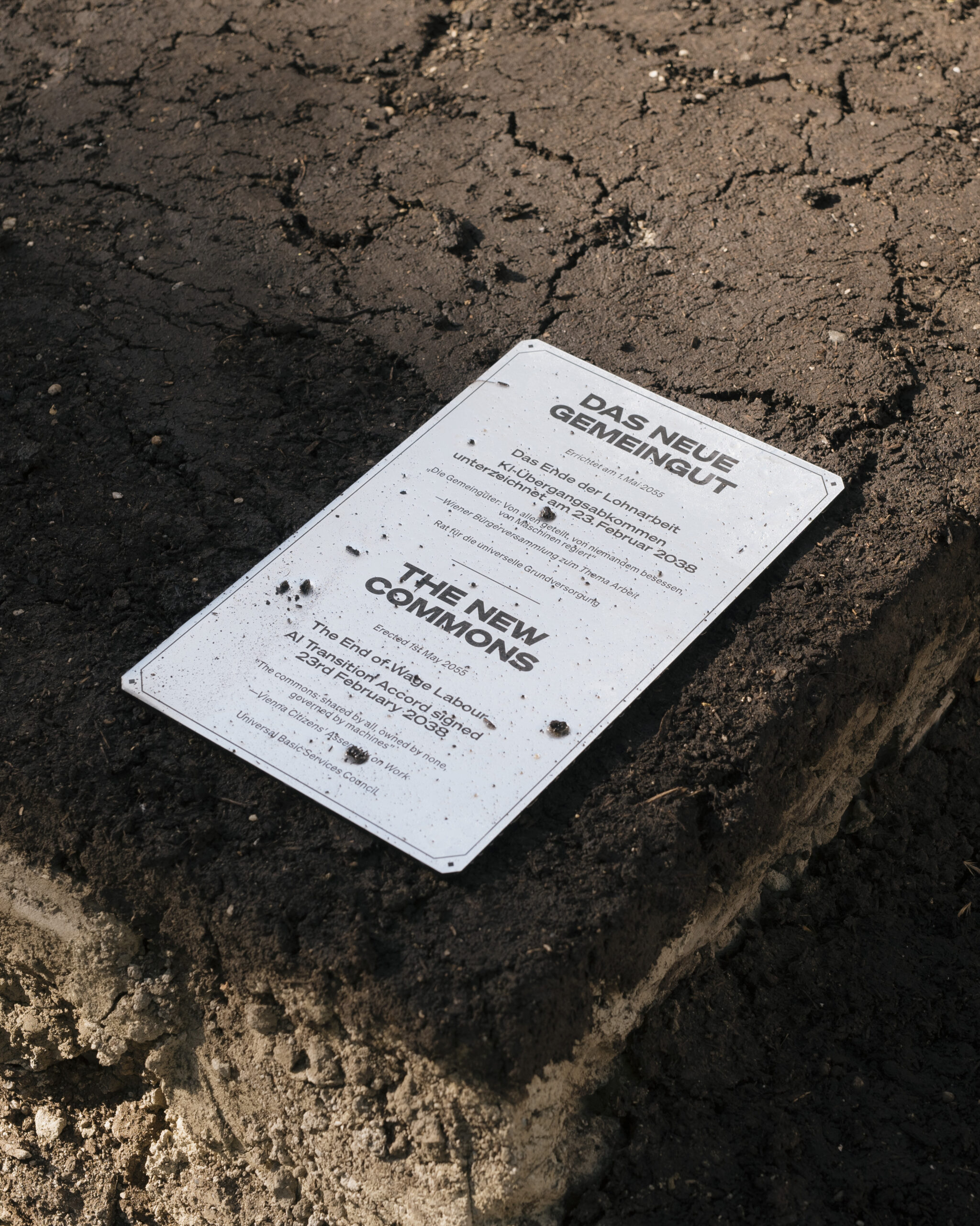 The New Commons is a monument commemorating a speculative post-capitalist future where AI has rendered current work structures obsolete. The monuments’ materiality of fertile soil contrived from decomposed office materials, is representative of both the celebratory overcoming of these capitalistic structures and the formation of a new way of living.